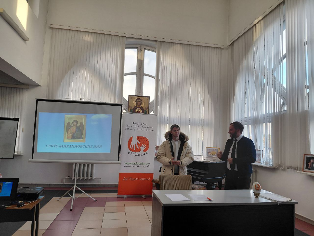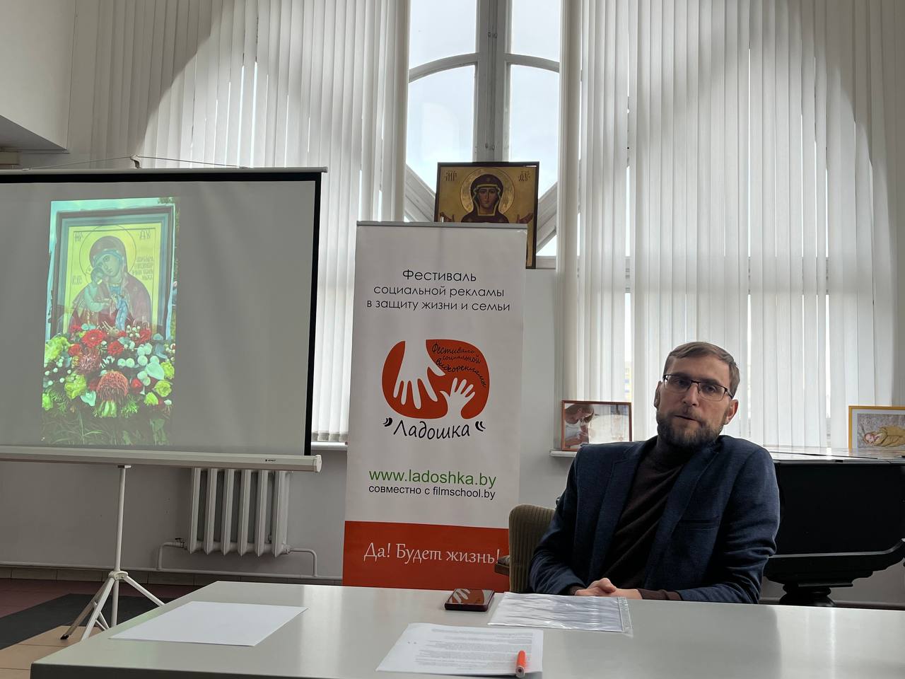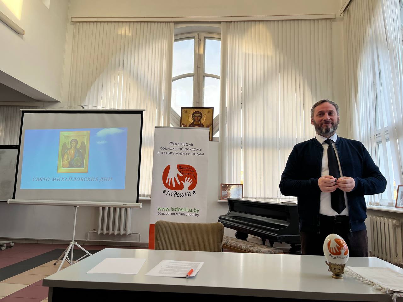 Затем состоялась встреча протоиерея Игоря Коростелева, настоятеля прихода храма в честь иконы Божией Матери “Всех скорбящих Радость”, духовника Международного фестиваля социальной рекламы в защиту жизни и семьи “Ладошка”, со студентами и преподавателями минских учреждений образования.